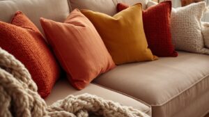 Tip: Mix solid colors with patterned cushions for a balanced look. This is a perfect example of how to decorate your living room with simple things that don’t cost much.